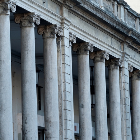 A row of elegant classical columns on an historical building facade, illustrating architectural beauty.