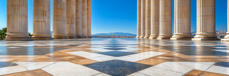 Classical Columns and Marble Floor Perspective View towards City Skyline on Sunny Day.