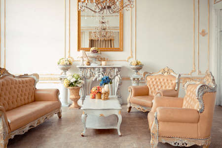 Luxury interior of a classic royal house. Sofa, armchairs, table and other furniture.