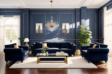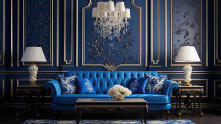 Luxury living room interior with a blue sofa and classic furniture