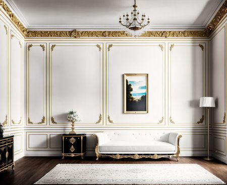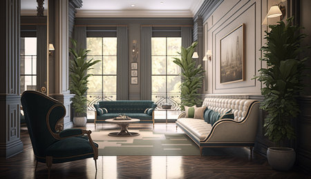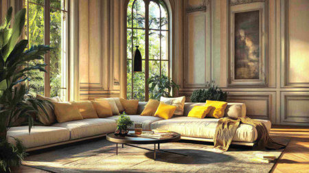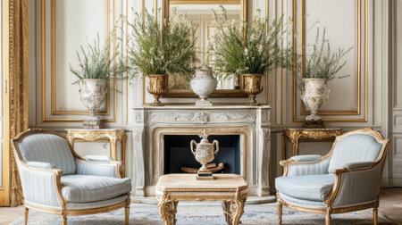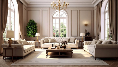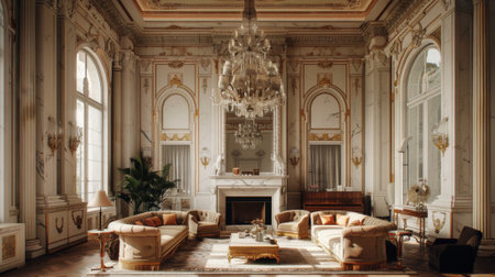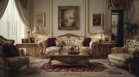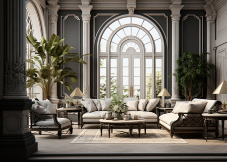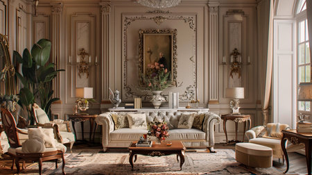 Discover an exquisite living room interior that radiates luxury and elegance, featuring ornate furniture, decorative plants, and timeless architectural details in a serene atmosphere.