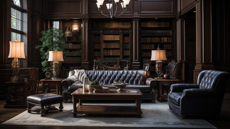 Luxury living room interior with bookshelf and leather sofa.