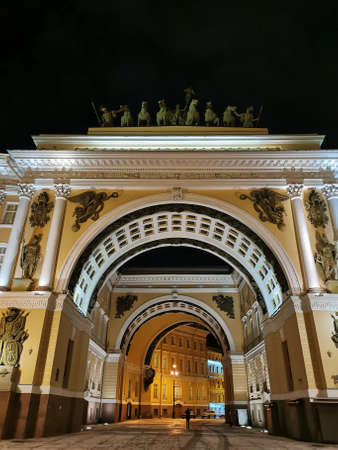 View from Palace Square in St. Petersburg to the arch of the General Staff building in an early winter morning against the background of a black sky.