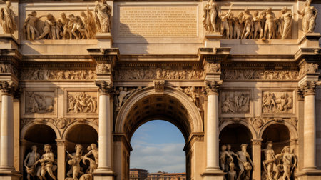 Milan, Italy - September, 01, 2022: grand triumphal arch decorated with statues and carvings, under blue sky in Milan