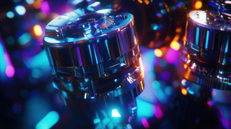 Innovative production line manufacturing futuristic metallic cylinders with colorful neon lights