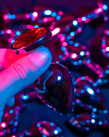 Man holding metal anal plug in neon pink purple light