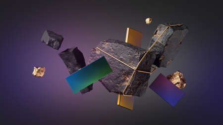 3d render, abstract background. Modern colorful wallpaper with levitating rocks, ruins, golden nuggets and iridescent metallic geometric shapes