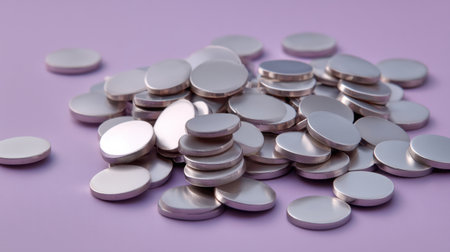 A stunning collection of shiny metallic coins arranged on a soft purple background, ideal for financial concepts, abstract art, and minimalist design themes.