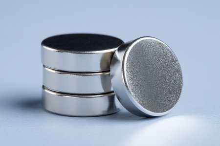 Three polished metal discs are stacked neatly, highlighting their shiny, reflective surfaces under soft lighting, creating an elegant and modern appearance.