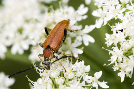 Longhorn beetle (Stictoleptura rubra) insect with long antennae on yellow Canadian goldenrod (Solidago canadensis) flowers
