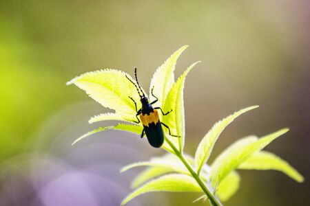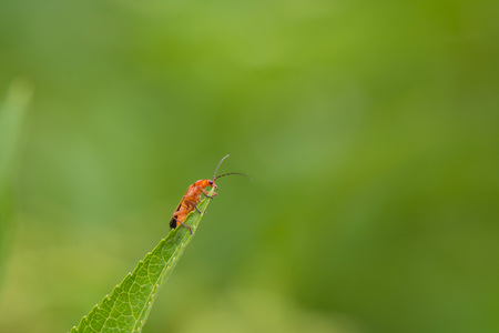 Orange beetle on a green leaf of a plant. Macro photography.