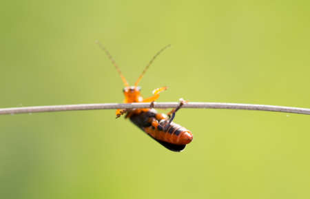 Beautiful red soldier beetle, Rhagonycha fulva, climbs vertically upwards on a cane stem, with a beautiful yellow-green blurred background