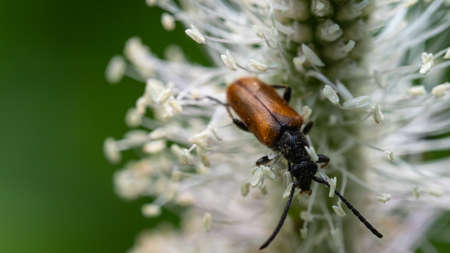 Musk beetle on top of tubular plant.