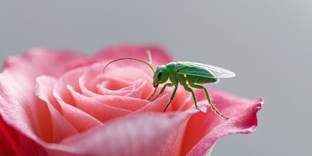 AI Generated. Macro shot of a green aphid on a red rose petal showcasing delicate features and translucent body