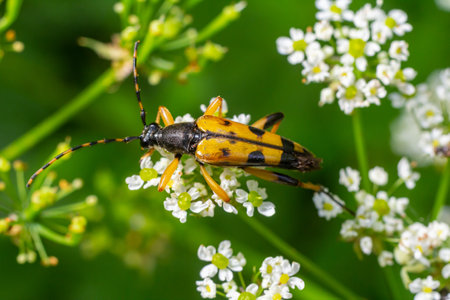 A yellow and black beetle is perched on delicate white wildflowers, surrounded by lush green foliage in a garden during spring, showing nature's beauty.