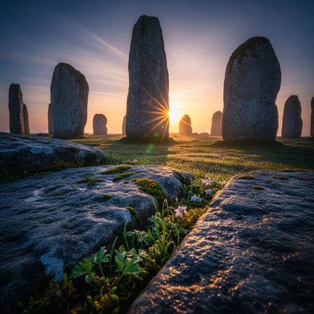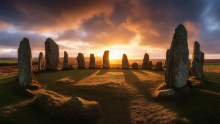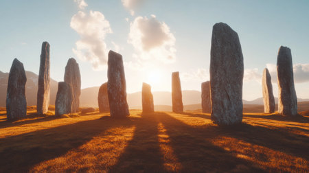A breathtaking view of an ancient stone circle silhouetted against a vibrant sunset sky, casting long shadows across the mystical landscape.