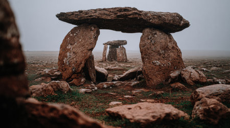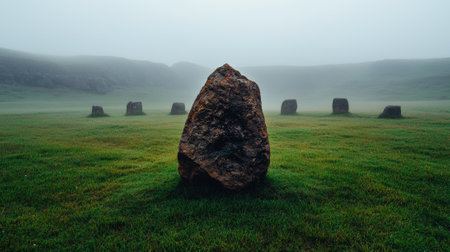 Ancient stones create a structure in open land surrounded by fog, highlighting their historical significance and mysterious atmosphere.