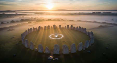 Ancient stone circle standing in a misty field at sunrise, with a vibrant orange and purple sky. the atmospheric fog creates a mysterious and historical landscape.