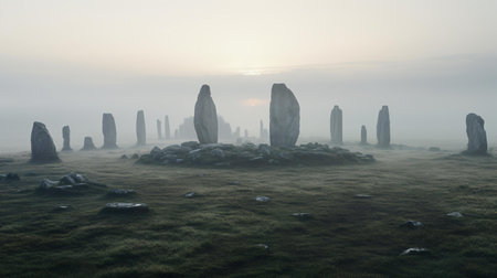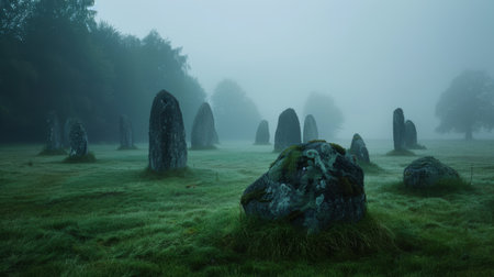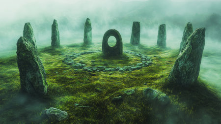 Mystical standing stones in a foggy landscape.