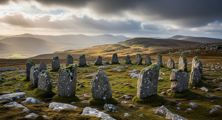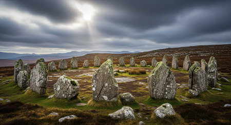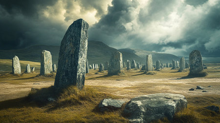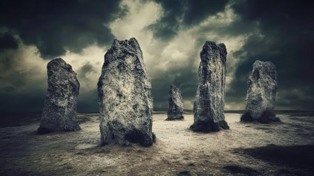Mysterious stone circle under stormy sky conveys ancient rituals