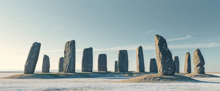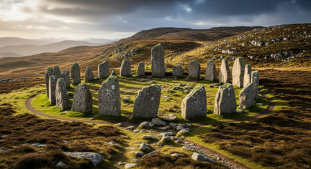 An image showcases a historic stone circle arrangement set in a grassy field. The composition includes large, weathered stones against a backdrop of a partly cloudy sky. The lighting suggests daytime with soft sunlight. This photograph could be utilized for editorial features or educational resources.