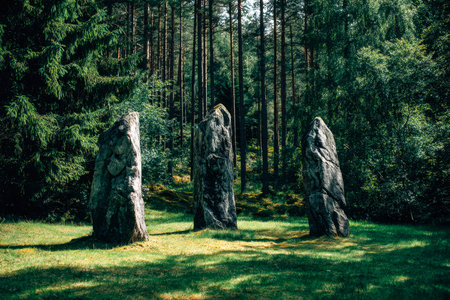 Moss-covered monoliths rise amid dense greenery, their silent presence evoking mystery as sunlight filters through vibrant leaves in a serene woodland setting.