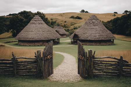 Fog surrounds wooden structures in an early medieval settlement, creating a quiet atmosphere that highlights natural textures and history.