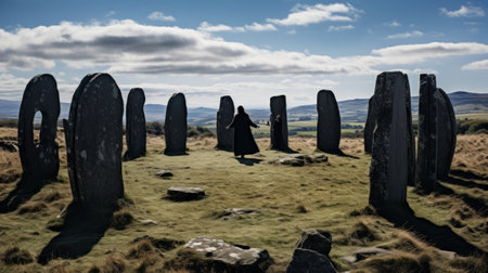 the scots monument centre captures the breathtaking landscape and ancient stone circles, using the zeiss batis 18mm f2.8 lens. the photograph showcases spiritual figures amidst dramatic lighting, resembling cinematic sets. with a touch of witchy academia, this contest-winning shot was taken on 70mm film, creating a mesmerizing visual experience. ai generated