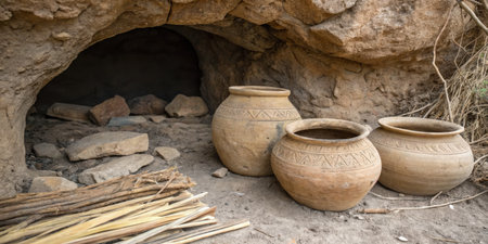 Three intricately designed clay pots rest near a cave entrance. Surrounding them are stones and dried plant materials, indicating a historical location rich in culture.