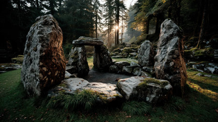 Massive stones create a mystical circle, bathed in gentle sunlight among lush greenery.