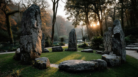 Stone circles at dawn in ancient setting