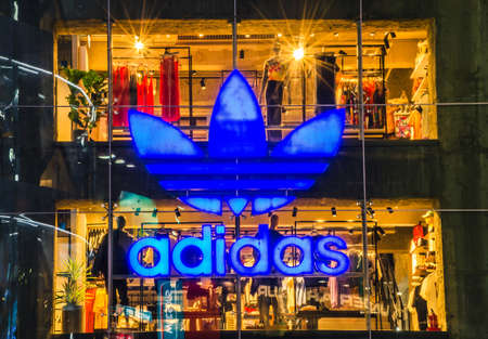 TAIPEI, TAIWAN - MAY 15, 2019 : Adidas store sign at Ximending shopping street at night, Taiwan. Adidas is a German corporation that designs footwear and clothing.