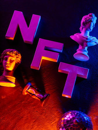 NFT Letters with Classical Sculpture Busts under Neon Pink Blue Lighting Crypto Art Concept