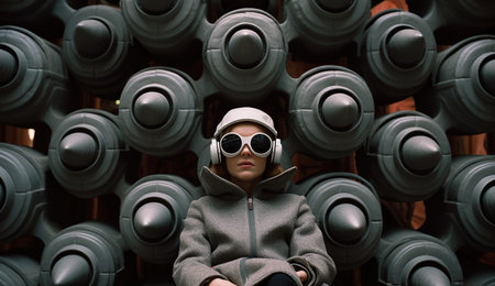 Portrait of a beautiful girl in a gray coat with headphones and sunglasses.