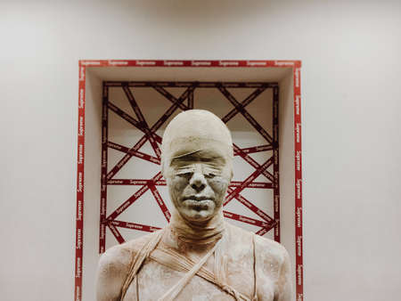 A man in a mummy suit on background of the logo supreme. Theme style and fashion. Halloween Costume Party. in makeup woman in bandages and clay is like a mummy without eyes. Ukraine, Kiev 12. 03. 2017.