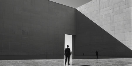 A minimalist composition featuring bold geometric shapes, sharp angles, and a restricted monochrome palette. The balance between negative space and form creates a sleek, modern aesthetic.