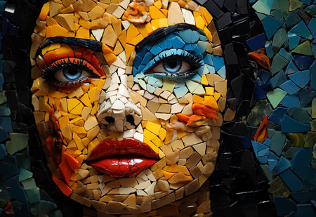 Portrait of a beautiful woman with colorful face made of ceramic tiles