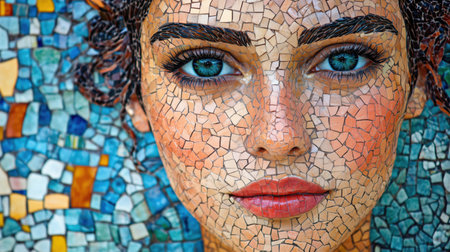 Mosaic portrait of a woman with blue eyes and red lips, representing beauty and art. Ai generated