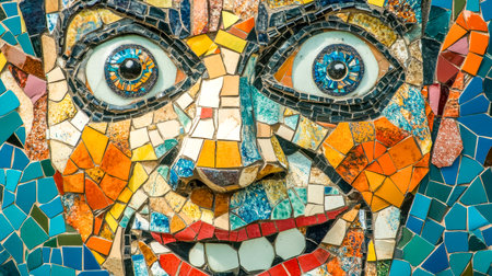The close-up reveals a detailed mosaic eye composed of colorful tiles, emphasizing artistic craftsmanship and vibrant hues that draw attention to its intricate design.