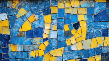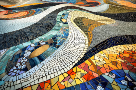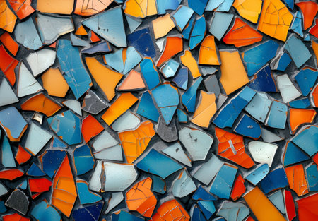 A captivating close-up shot of a vibrant mosaic wall, showcasing a stunning blend of textures and colors. Perfect for artistic and interior design projects.