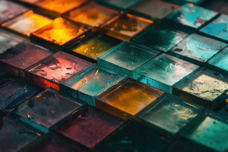 Stunning macro shot of colorful glass tiles forming a textured surface, shining with glossy finish and vibrant colors, creating abstract background for modern design in interior spaces