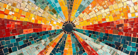 Colorful mosaic featuring a sunburst pattern with a range of colors, forming a dynamic and radiant design.