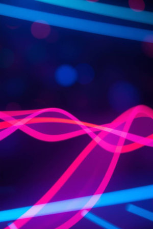 Pulsating neon lights create a vibrant rhythmic overlay on dark background