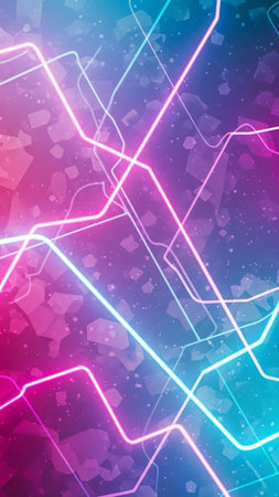 Luminous showing vibrant neon light trails in pink and cyan forming geometric patterns against a bokeh background with hexagonal shapes and speckles keywords: neon,...