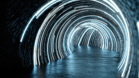 A tunnel with bright lights in it and a brick wall, AI