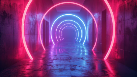 This image showcases vibrant neon arches in blue and pink hues, illuminating a dark room with a smooth floor, creating a captivating and modern ambiance.
