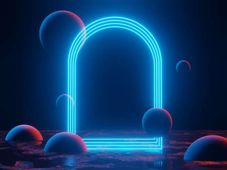 The render includes an abstract minimalist background, a pink violet blue neon arch, mysterious terrain, a strange landscape, an underwater line glowing in the dark, ultraviolet light, and a retro