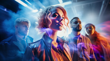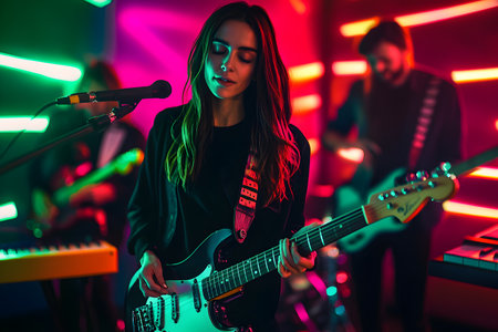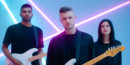 Musicians pose together in a contemporary studio, illuminated by colorful neon lights, highlighting their instruments and the energetic vibe of the music scene