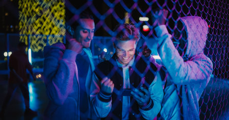 Group of Young Diverse Men Watching a Sports Game on Smartphone Device, Cheering for Their Favorite Team. Celebrating Goal, Betting or Lottery Win. Standing Outside in Urban