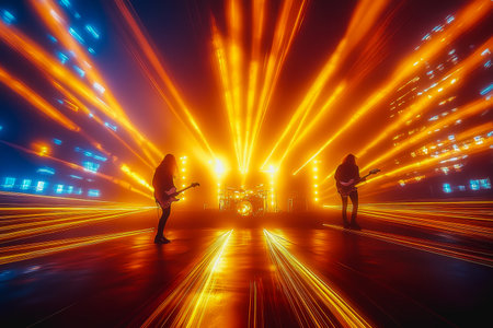 Band performing live music under vibrant stage lights, creating an electrifying atmosphere during an unforgettable concert event